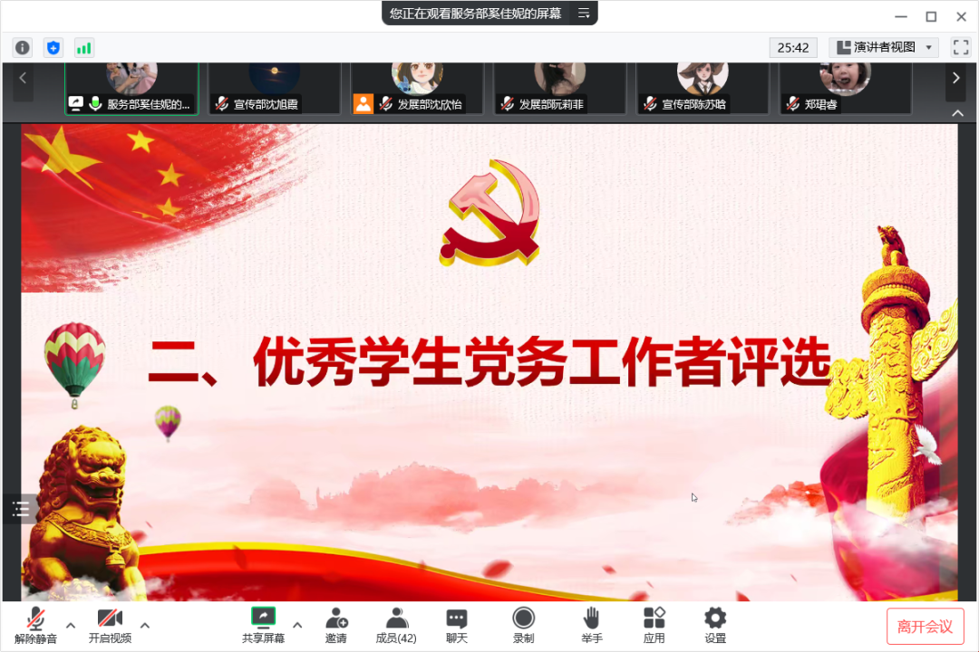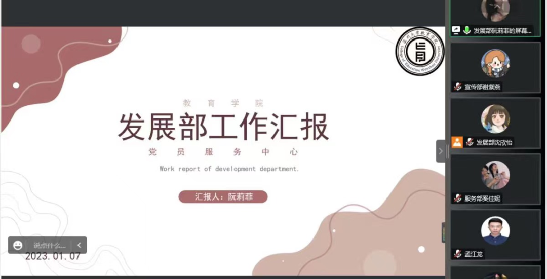 2023年1月7日下午,91吃瓜 党员服务中心召开2022-2023学年第一学期总结大会。本次大会以线上腾讯会议的形式举行,院党服指导老师孟江龙、院党服全体成员及各学生党支部书记助理参会,院党服服务部干事奚佳妮主持。