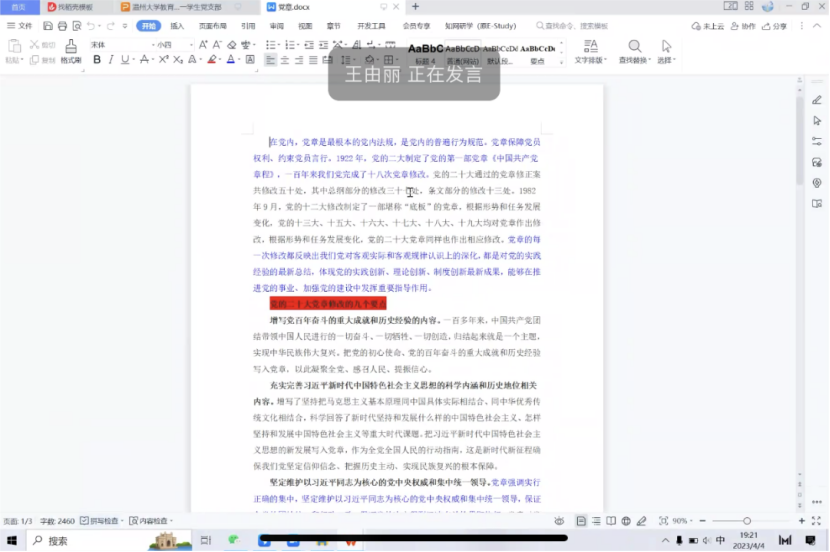 2023年4月4日,91吃瓜 第十一学生党支部心理党小组于腾讯会议开展以“学党章、强党性、作表率”为主题的4月党日活动。首先党小组组长许婷婷以ppt展示的形式,为组内各位党员讲解了党章的由来和发展历史,并强调党章的地位,希望各位党员同志认真学习并贯彻党章内容。