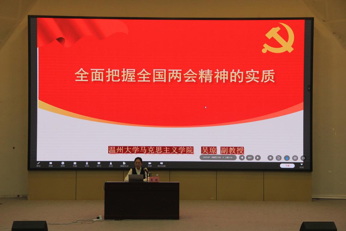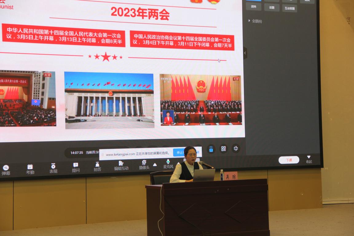 讲座伊始,吴琼老师为同学们介绍了2023年全国两会召开的基本情况。她指出,今年两会的召开具有重要意义——2022年党的二十大胜利召开,描绘了全面建设社会主义现代化国家的宏伟蓝图,而2023年是全面贯彻落实党的二十大精神开局之年。她强调,今年习近平总书记全票当选中华人民共和国主席、中华人民共和国中央军事委员会主席,习近平总书记在执政浙江时曾提出“八八战略”,从多方面对浙江的发展问诊把脉。吴琼老师从“八八战略”谈到温州的“四千精神”,介绍了社会主义发展民营经济的方法与途径,并强调这种精神需要不断继承与发扬。她还指出,今年的两会还是国家政府机构改革的一年,经过历次政府机构改革,我们国家的机构基本趋于稳定,从而真正满足我国发展与人民生产生活的需要。