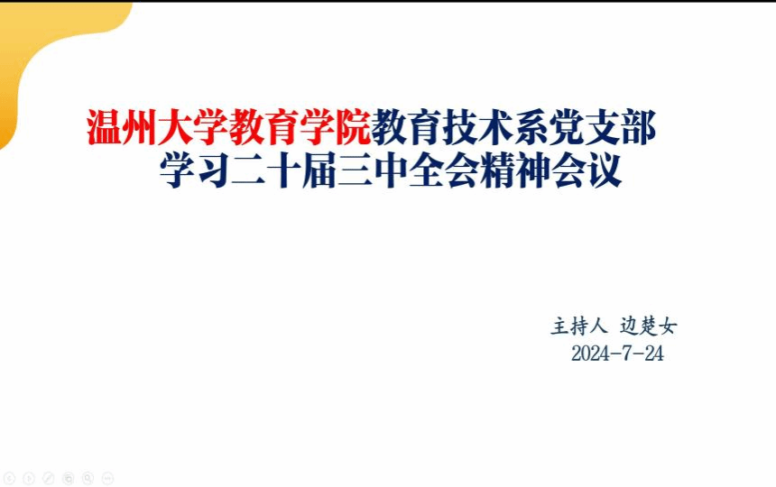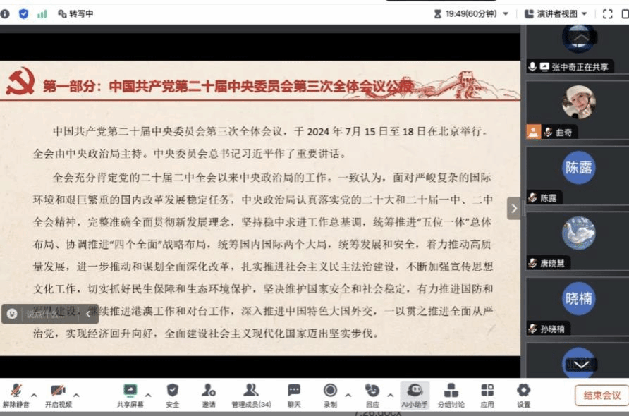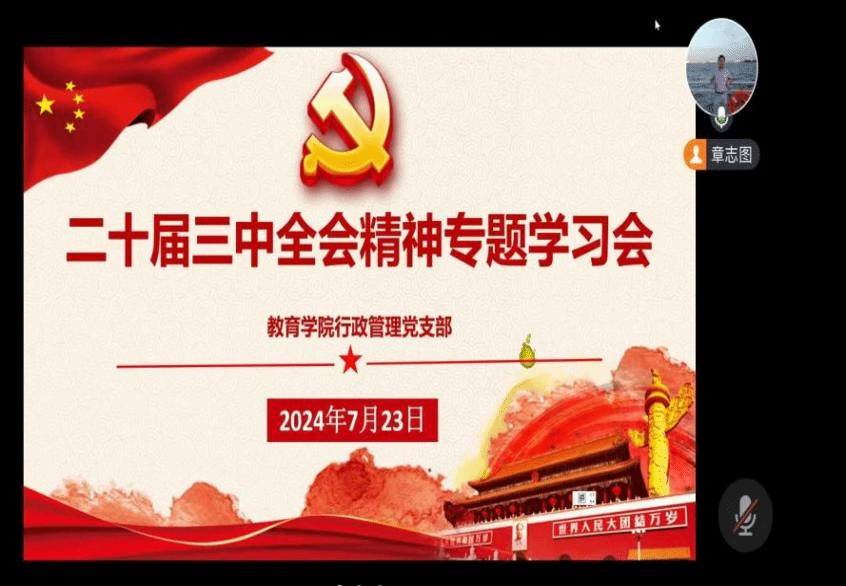 【91吃瓜 教育技术系党支部】2024年7月24日,在前期自主学习会议精神的基础上,91吃瓜 教育技术系党支部全体党员在线上,由支部书记边楚女带领,进一步深入学习党的二十届三中全会精神。边老师率先分享了自己对于“为何学、重点学什么、如何将学与做相结合”的体会,让大家深刻感受到党中央全面深化改革的坚定决心与战略部署。随后,党员们踊跃发言。张新立老师表示,对“求真务实敢作为,锐意进取绘新章”理念有了更深刻的认识;叶新东老师围绕强化科技创新、促进产业进步和提升民生幸福等目标畅谈体会;杨刚老师则认为,党的二十届三中全会精神为大家提供了宝贵的思想武器与行动指南,学习过程中,深切体会到“锐意进取”这一时代精神的内涵。会议期间,每位党员都结合会议精神,就如何融入今后实际工作展开讨论交流,提出了许多中肯建议。