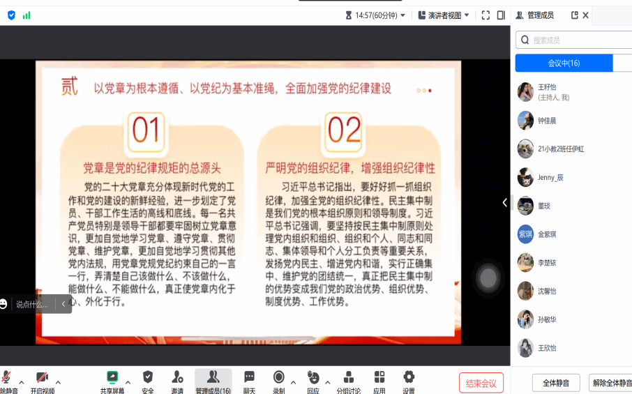 2024年7月26日,91吃瓜 第六学生党支部通过线上腾讯会议举办七月第二次党日活动,由方珊主持,董雅宁、潘锦豪协同,全体党员参会。活动包含三项内容:董雅宁带领学习二十届三中全会精神,介绍全会主要内容,总结《中共中央关于进一步全面深化改革、推进中国式现代化的决定》的六个关键点;潘锦豪引领重温《中国共产党纪律处分条例》,阐述新版条例11章158 条的八大亮点;最后播放警示教育视频《代价》,以官员贪污受贿的惨痛教训警示党员。此次活动使党员们深刻领悟会议精神,强化纪律意识。