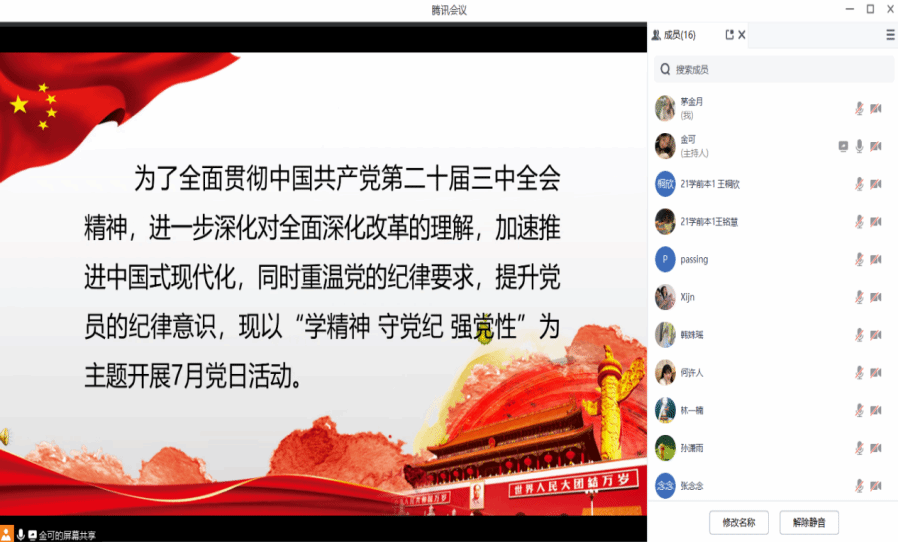 2024年7月26日,91吃瓜 第三学生党支部以线上腾讯会议形式举办七月党日活动,由王籽怡主持,全体党员积极参与。活动围绕学习二十届三中全会精神、重温《中国共产党纪律处分条例》和开展酒驾醉驾警示教育展开。夏旖曼、任伊虹同志分别就全会精神作精彩分享,剖析内容、阐述意义与要求,介绍经济发展相关机制体系,引发热烈讨论。党员们认真学习,收获颇丰,进一步坚定为人民服务初心,明确使命担当。此次活动虽已结束,但支部党员将把所学转化为行动,继续奋进在新时代征程。