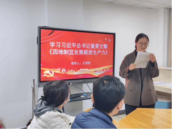 紧接着,王恬恬同志领学 习近平总书记重要文章《因地制宜发展新质生产力》,该文章为党员们深刻理解和把握新质生产力的核心要义、发展路径提供了根本遵循,引导党员立足自身岗位,以创新驱动为核心,因地制宜地为发展新质生产力贡献智慧和力量,赋能经济社会高质量发展。