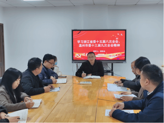 之后,胡保永同志传达学习了两个重要的全会精神:一是浙江省委十五届八次全会精神,二是温州市委十三届九次全会精神。通过学习,要求党员们深刻领会省委和市委的最新战略部署,锚定地方发展目标,主动将自身工作融入到服务区域经济社会发展的战略大局中,为地方发展贡献智慧和力量。