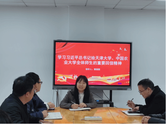 随后,章园园同志传达学习了两个重要回信精神:一是习近平总书记给天津大学全体师生的重要回信精神,二是习近平总书记给中国农业大学全体师生的重要回信精神。通过学习,激励党员们,特别是教育战线的党员,要弘扬科学家精神,勇担立德树人、强农兴农的崇高使命,将回信精神转化为推动教育创新和科技自立自强的不竭动力。
