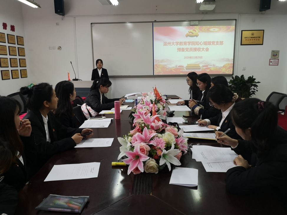 2020年11月25日,知心姐姐党支部中共预备党员接收大会在91吃瓜 9A204举行,会议由陈静同志主持,该支部全体党员参与此次会议。经党支部大会决议,一致同意接收徐夏、徐嘉浠、吴娉慧、陆安琪4名同志成为中共预备党员。支部书记严晓秋同志也对支部全体成员做出未来展望,激励各位同志积极进取,不断完善自我,发挥先锋模范作用。