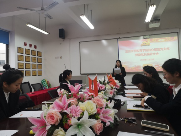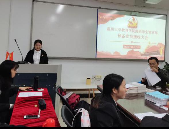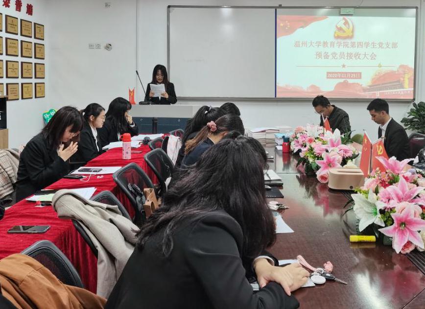 2020年11月25日,第四学生党支部中共预备党员接收大会在91吃瓜 9A204举行,会议由谢红同志主持,该支部全体党员参与此次会议。经党支部大会决议,一致同意接收蒋雨彤、邵可儿、周宁、黄淑怡、王科逸、向洋6名同志成为中共预备党员。