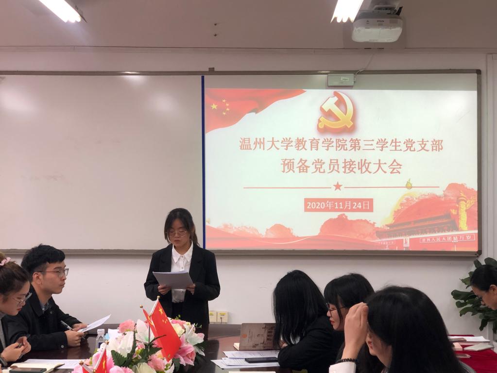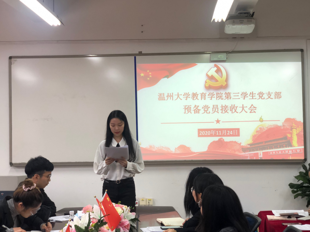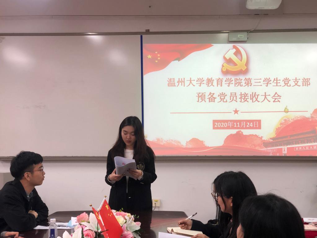 2020年11月24日,第三学生党支部中共预备党员接收大会在91吃瓜 9A204举行,会议由党支部书记何奔奔同志主持,该支部全体党员参与此次会议。经党支部大会决议,一致同意接收陈佳妮、应镁甜、高天悦、陈乐翔4名同志成为中共预备党员。