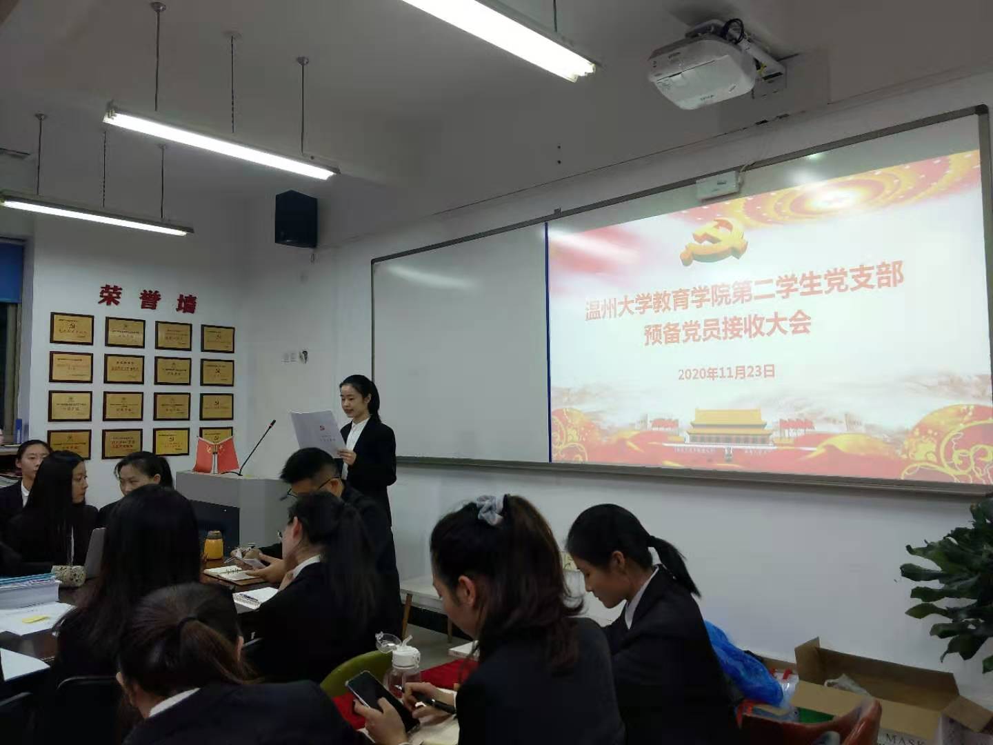 2020年11月23日,第二学生党支部中共预备党员接收大会在91吃瓜 9A204举行,会议由谢佳希同志主持,该支部全体党员参与此次会议。经党支部大会决议,一致同意接收韩钱悦、谢灿莉、徐莹莹、余欣媛、贺静雯5名同志成为中共预备党员。