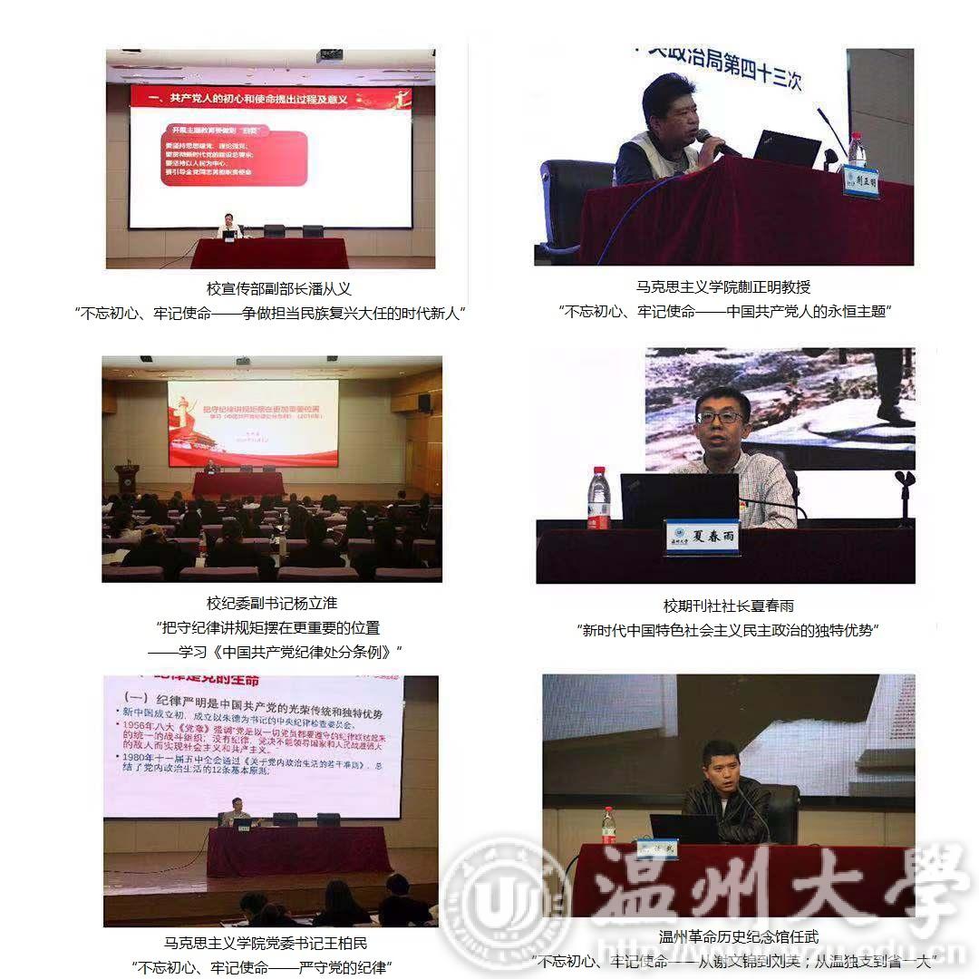 本期培训班在校党委的正确领导、各学院分党校的悉心指导和各学员的认真参与下圆满完成了培训任务。校党委宣传部副部长潘从义以“不忘初心、牢记使命—争做担当民族复兴大任的时代新人”为主题、马克思主义学院蒯正明副教授以“不忘初心、牢记使命—中国共产党人的永恒主题”为主题、校纪委副书记杨立淮以“把守纪律讲规矩摆在更加重要的位置—学习《中国共产党纪律处分条例》”为主题、校期刊社社长夏春雨以“新时代中国特色社会主义民主政治的独特优势”为主题、马克思主义学院党委书记王柏民老师以“不忘初心、牢记使命—严守党的纪律”为主题、温州革命历史纪念馆任武以“不忘初心、牢记使命—从谢文锦到刘英;从温独支到省一大”为主题从不同角度为学员们上了精彩党课。