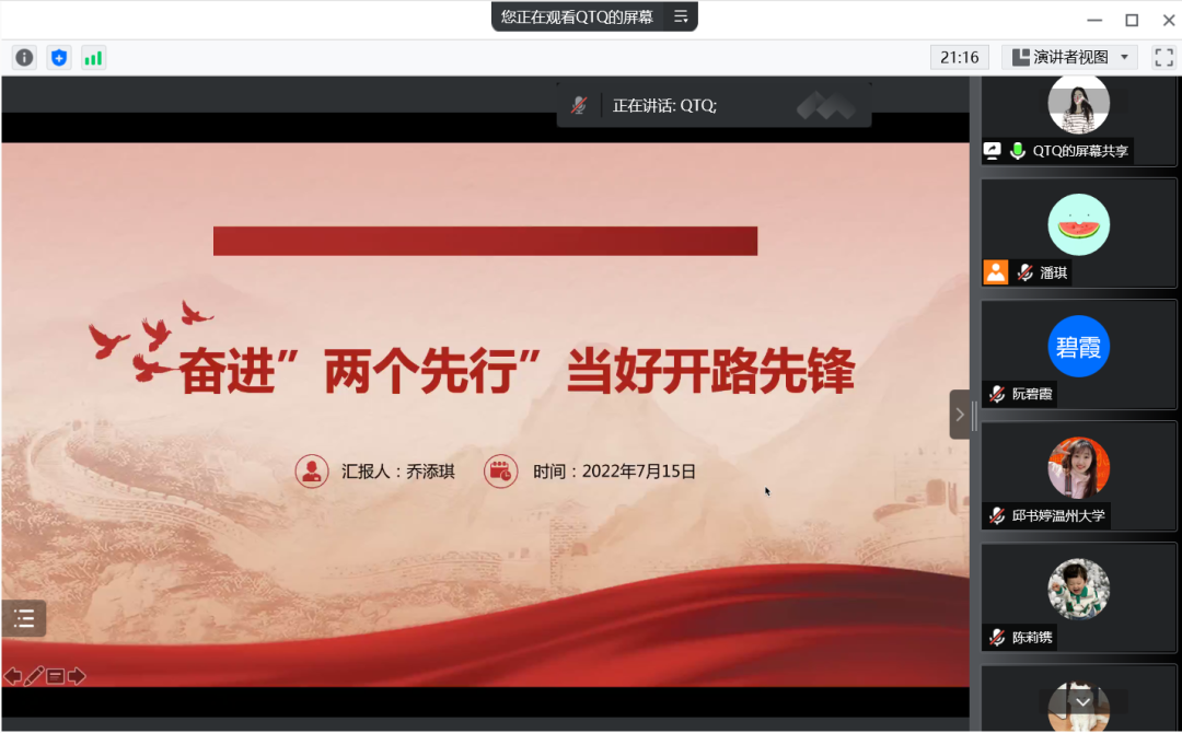 2022年7月12日,91吃瓜 第九学生党支部于钉钉会议线上举行了“奋进‘两个先行’ 当好开路先锋”和“红七月·服务月”活动暨“当先锋、争先行”主题党日活动。第九学生党支部全体党员参加了活动,本次活动由王旦主持。