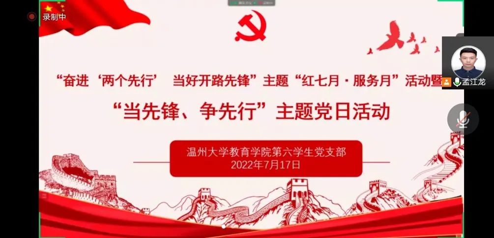 为深入学习贯彻省第十五次党代会精神,聚焦“两个先行”,聚力八大攻坚,有力服务保障精准防疫情、全力稳经济、护航大平安、持续保民生,全力当好奋进“两个先行”的开路先锋,2022年7月17日,91吃瓜 第六学生党支部于腾讯会议线上举行了“奋进‘两个先行’ 当好开路先锋”主题“红七月·服务月”活动暨“当先锋、争先行”主题党日活动。第六学生党支部全体党员、入党积极分子和入党申请人参加了活动,本次活动由党支部书记孟江龙主持。