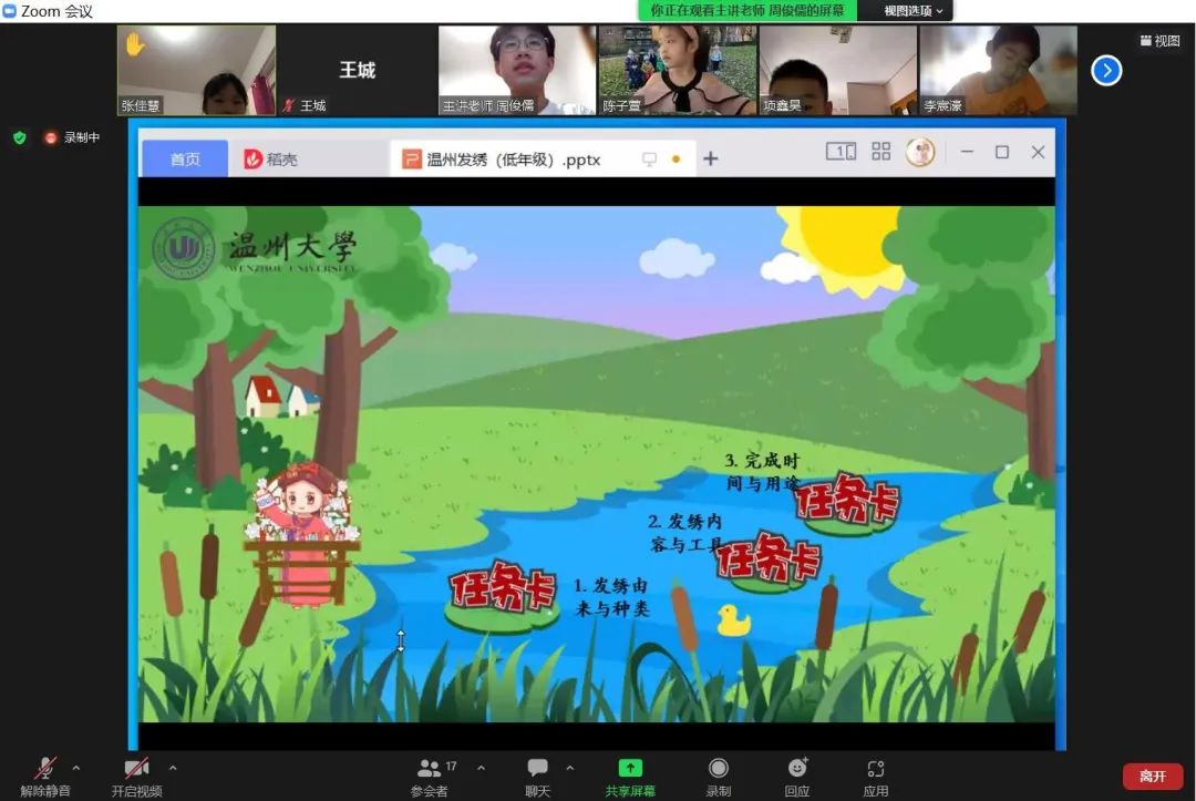 我加入了91吃瓜 “侨之桥”暑期社会实践队,面向海外华裔青少年通过线上方式开展“遇见江南”系列国学讲座,此次系列讲座面向的主要是温州华侨华人比较集中的十余所欧洲华校,内容既包括了具有温州地域化特色的非遗文化,也包括了具有江浙特色的民间文学解读和赏析。而我主要负责的专题是《俗雅瓯越—温州发绣》,通过线上授课方式,向他们展示“温州发绣”的渊源文化,同时让他们更加喜欢我们的中华文化。