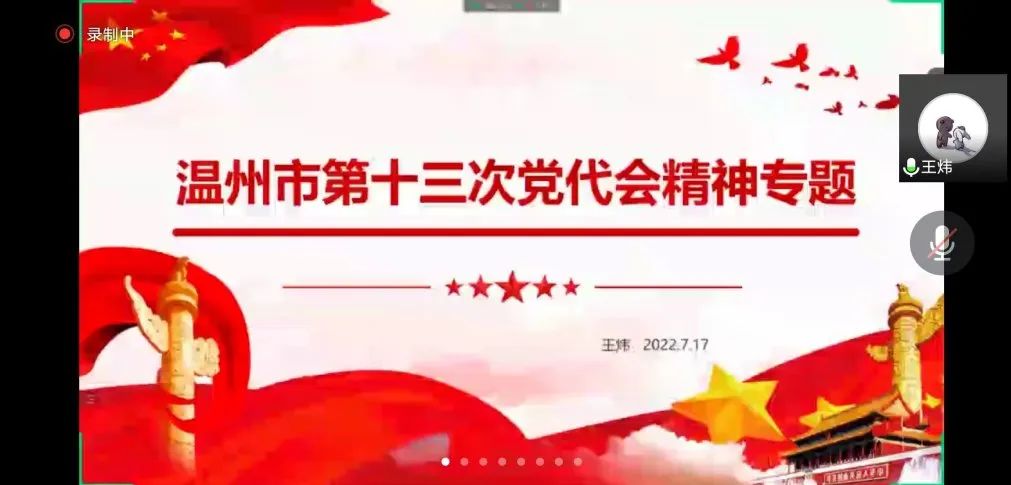 王炜同志围绕温州市第十三次党代会精神专题有关内容进行微党课分享,她以一条主线、六个先行、四大振兴、十项重点举措为主要内容,带领大家重温了温州市第十三次党代会精神。