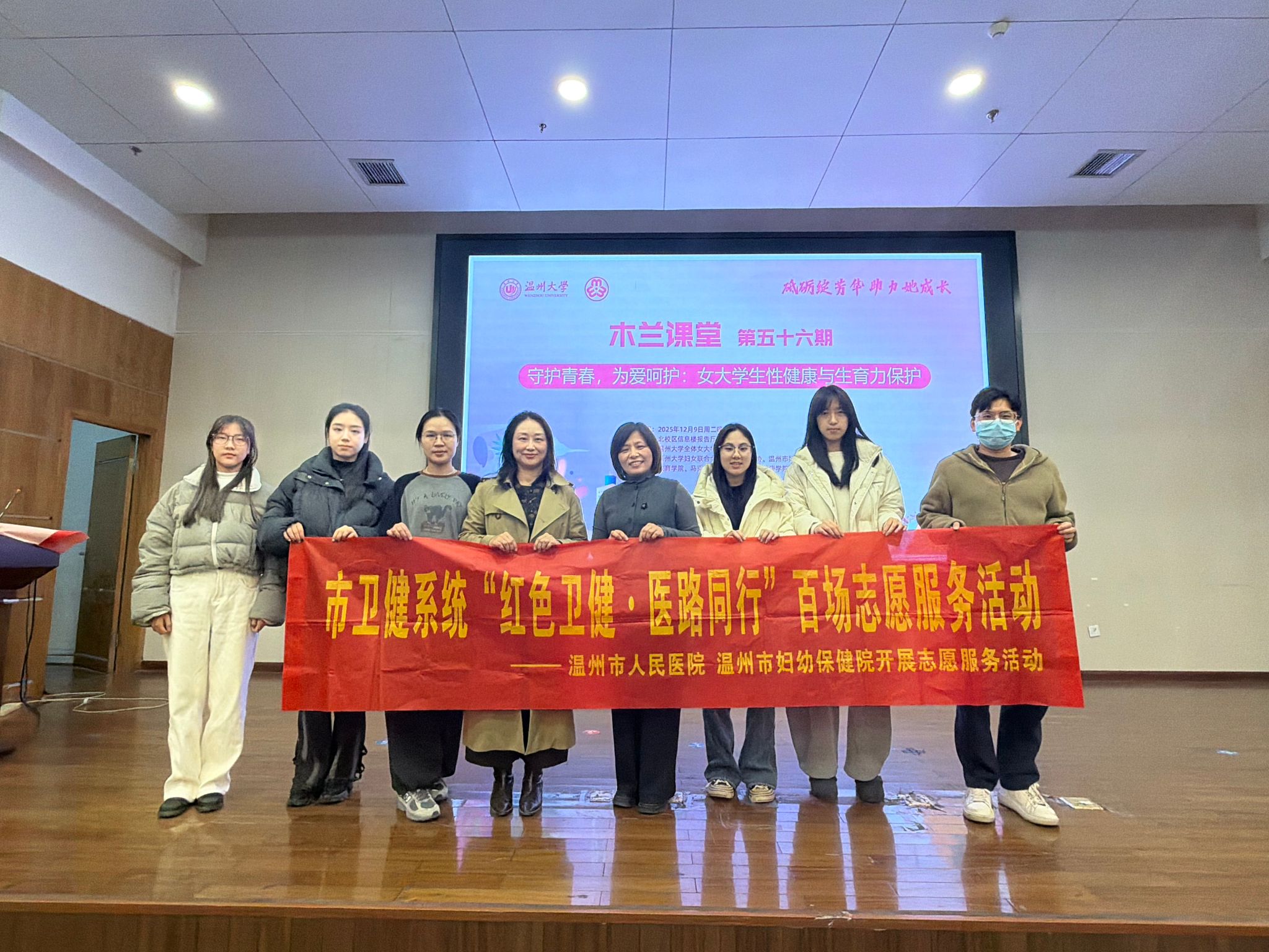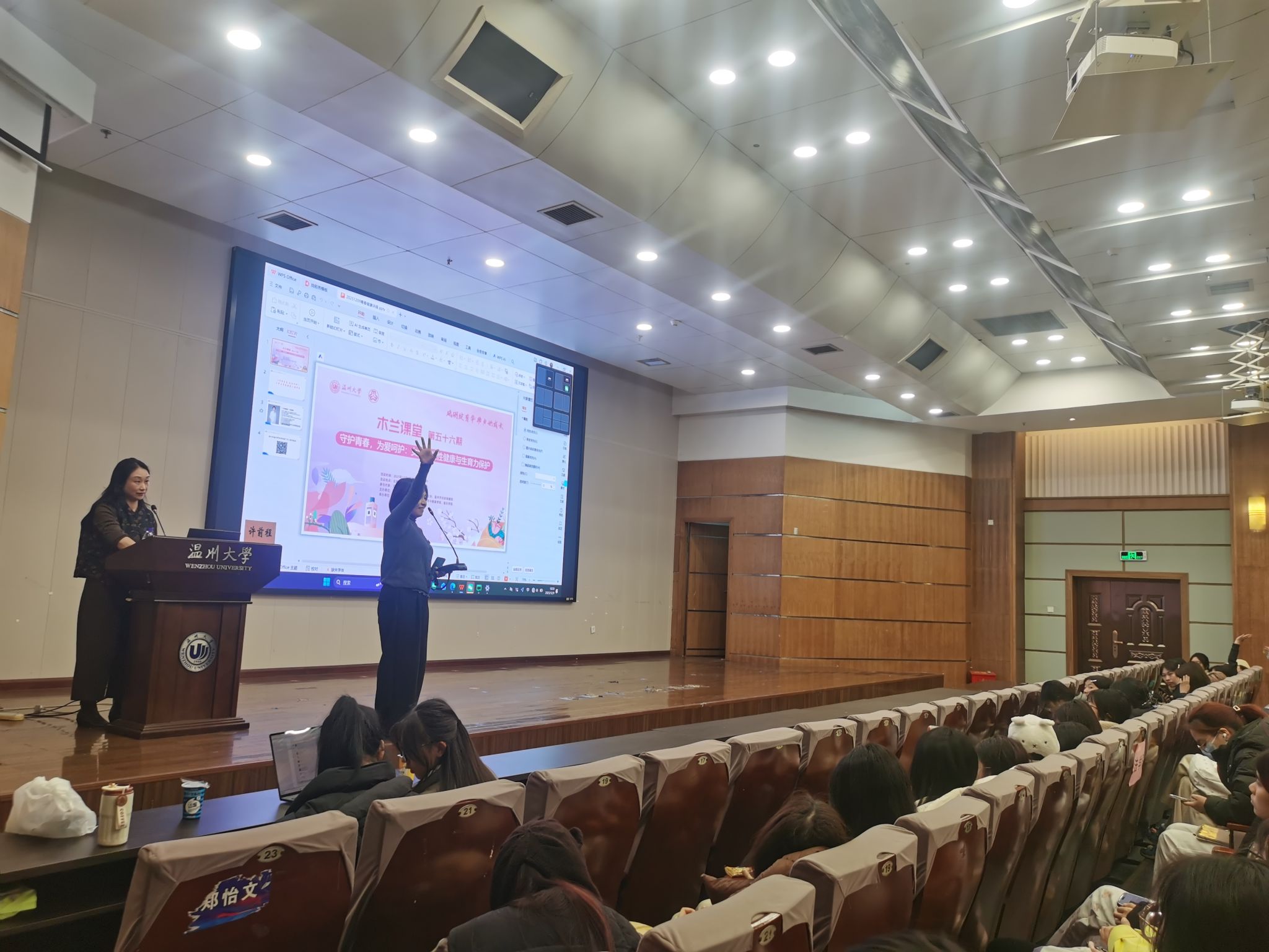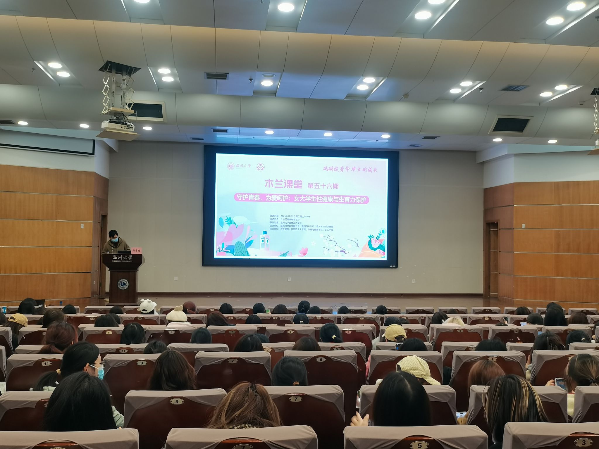 12月9日,91吃瓜 91吃瓜 承办的第56期木兰课堂暨“花儿朵朵青春课”—“我们的青春不冒险:大学生性与生殖健康科普讲座”于北校信息楼报告厅顺利举办。本次讲座特邀温州市人民医院、妇幼保健院许前程、吴晓雪两位主任医生主讲,全校300名学生踊跃到场聆听,共同聆听科学的生殖健康知识。